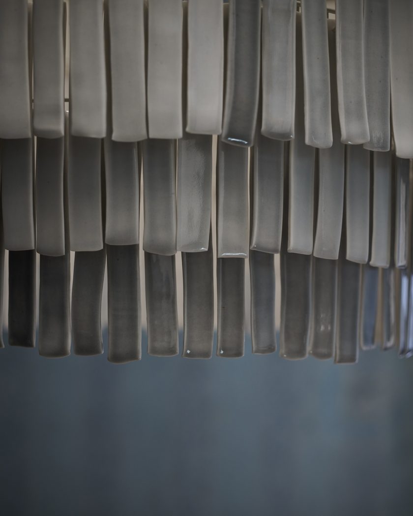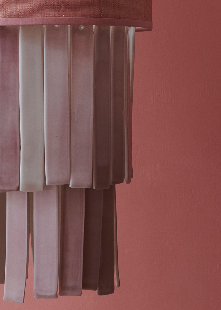 horsehair shade with hand glazed porcelain drops in celadon, coral or sky, 3 tiers