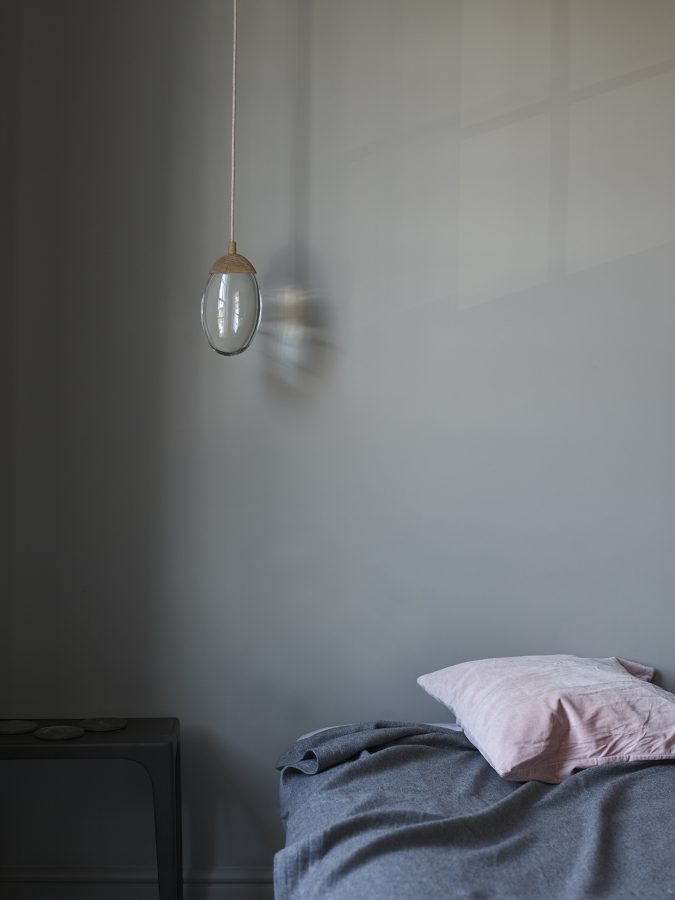 pendant with solid glass drop illuminated by LEDs, fitted with carved oak cap and matching canopy
