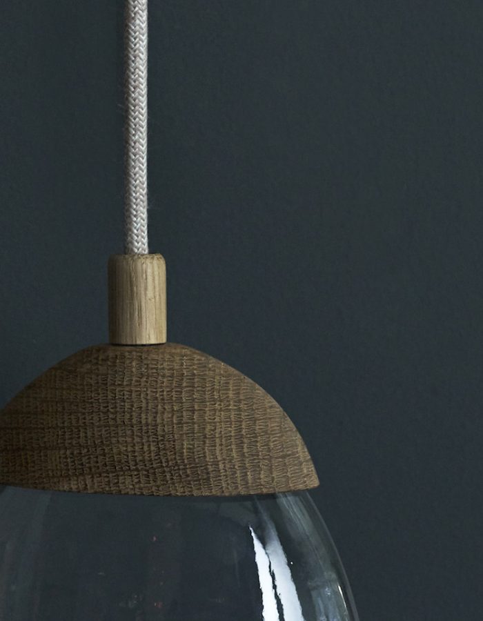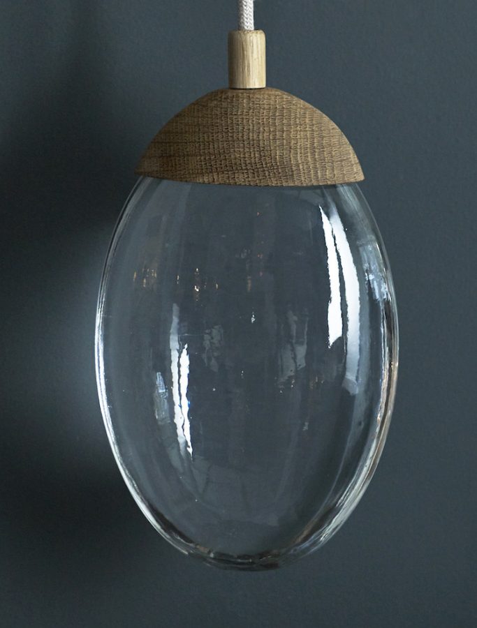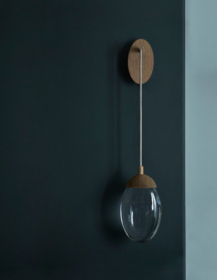 wall light with solid glass drop illuminated by LEDs, fitted with carved oak cap and matching canopy