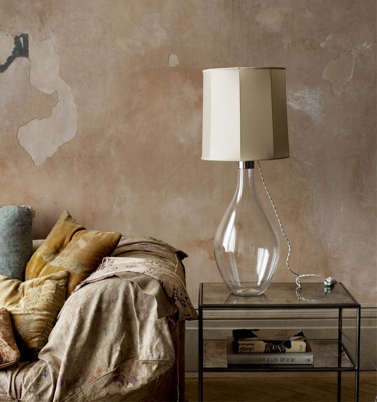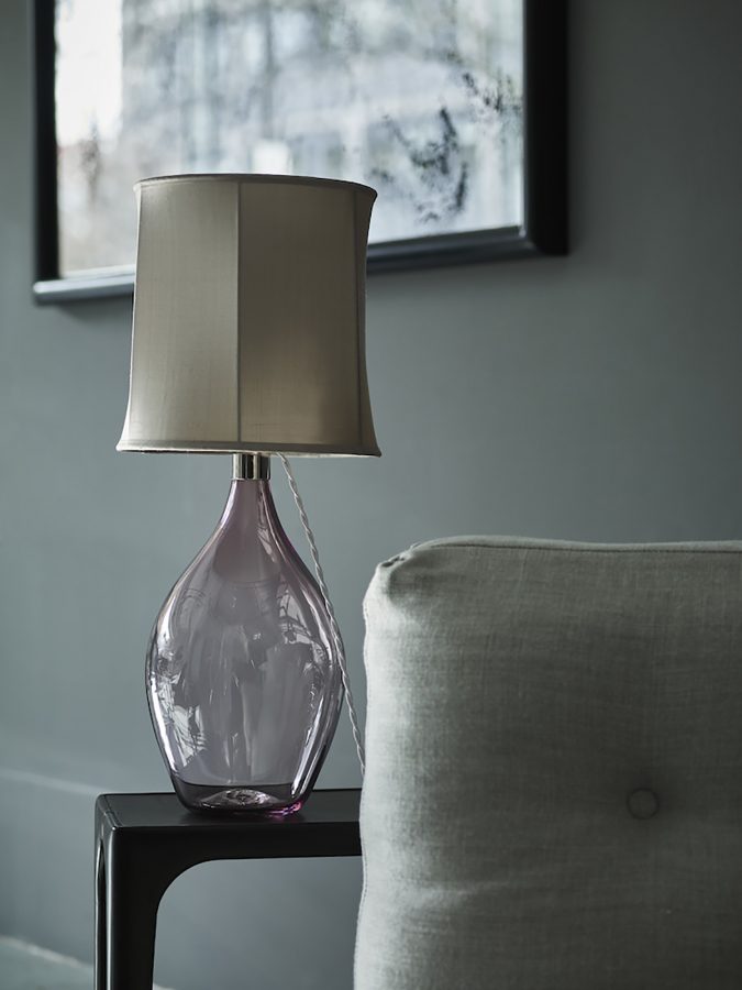 hand blown glass table lamp base with nickel fittings and shade in silk