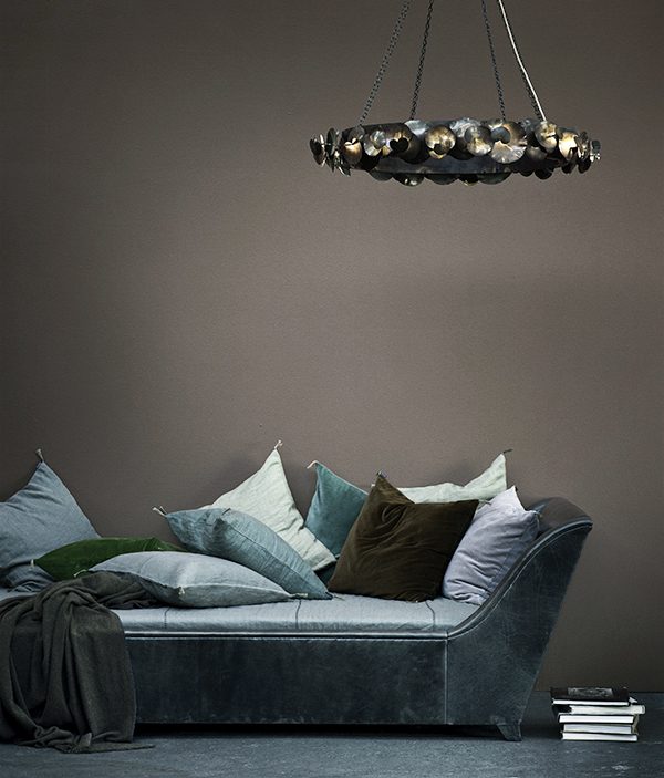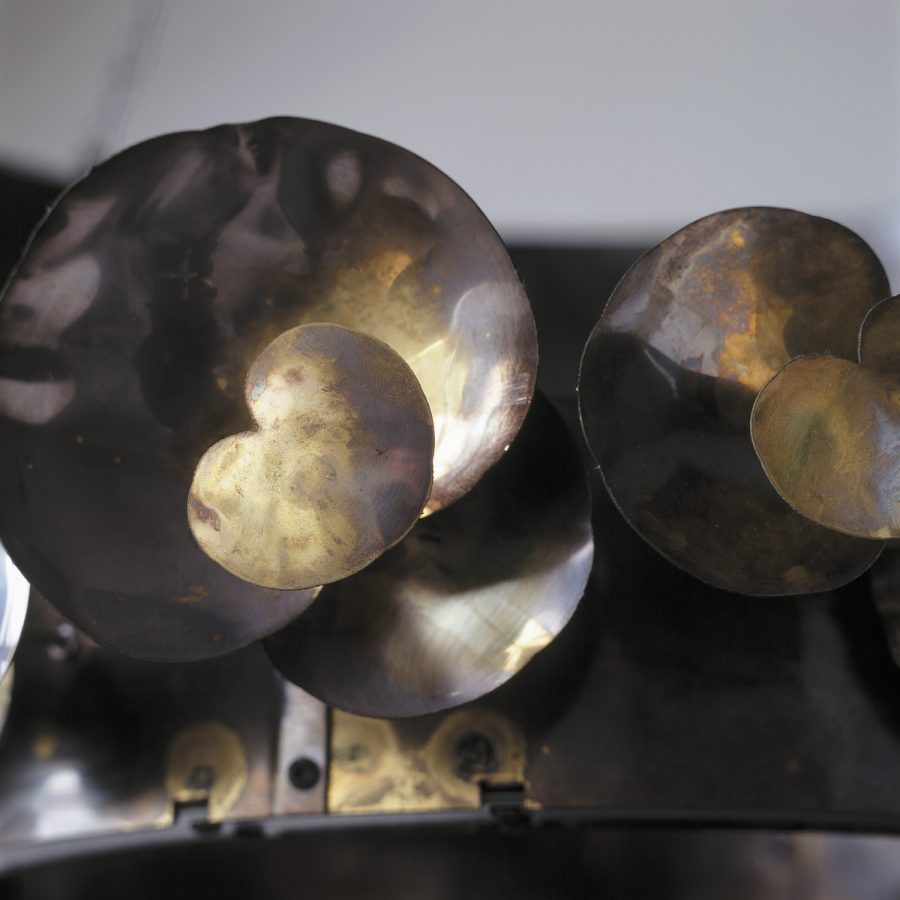 chandelier with leaves in patinated brass or pewter finish, illuminated by LEDs