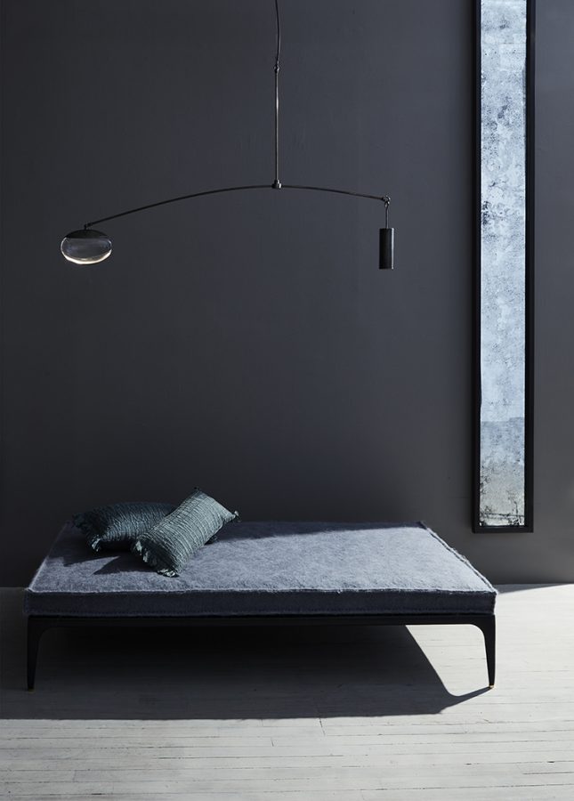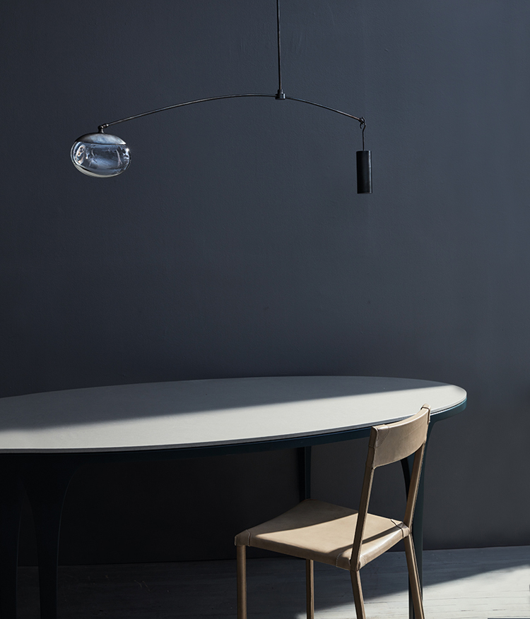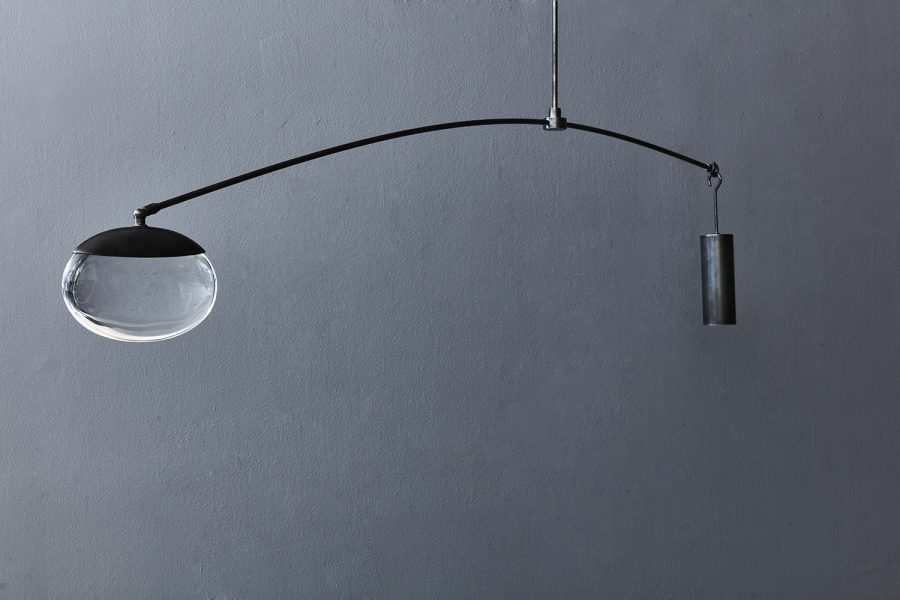 pendant with solid glass drop illuminated by LEDs, blackened nickel cap with matching counterweight and canopy