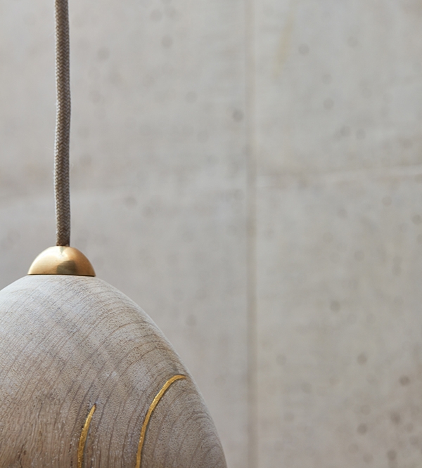 pendant with turned green oak shade with gold leaf accents, oak canopy and polished brass fittings