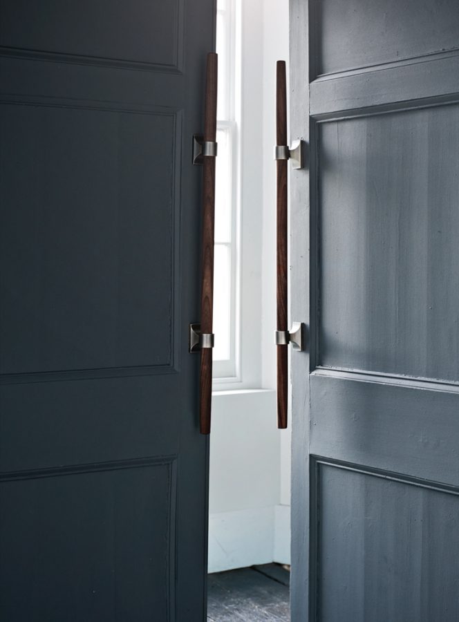 handle in walnut or oak fitted with two patinated bronze or pewter knuckles